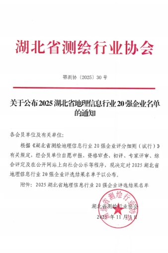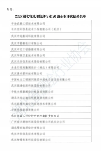 近日,從湖北省測繪行業(yè)協(xié)會(huì)傳來喜訊,武漢市政院憑借卓越的技術(shù)實(shí)力與行業(yè)貢獻(xiàn),成功獲評(píng)“2025湖北省地理信息行業(yè)20強(qiáng)”。這一榮譽(yù)標(biāo)志著公司在測繪地理信息領(lǐng)域的專業(yè)能力獲得省級(jí)權(quán)威認(rèn)可,為企業(yè)發(fā)展里程碑再添濃墨重彩。