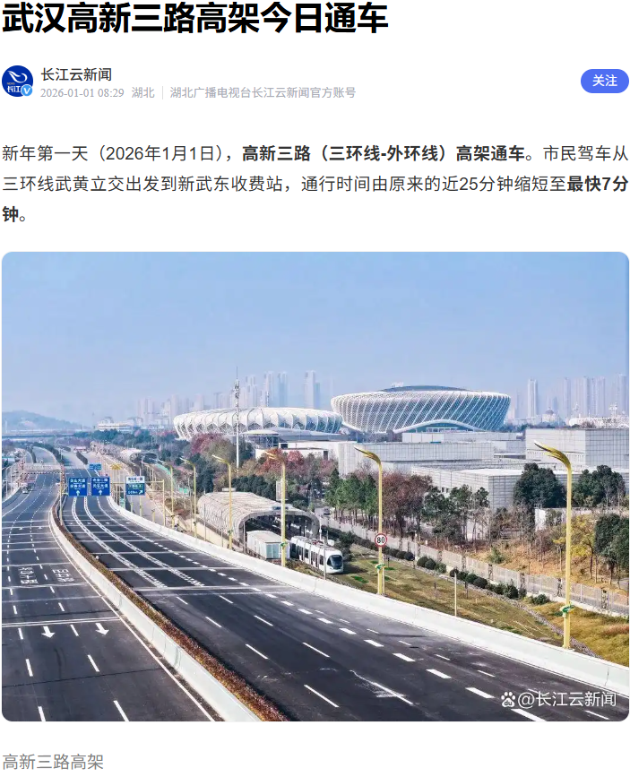 2026年1月1日,由武漢市政院參與設計的高新三路(三環(huán)線~外環(huán)線)改造提升工程主線高架通車!這條西起三環(huán)線武黃立交、東至新武東收費站,總長10.7公里(其中主線高架8.23公里)的交通大動脈,以“主線高架+地面輔道”的立體格局,打通了光谷東向通行瓶頸,也承載著武漢市政院在綠色建造領域的技術突破,為武漢智慧交通建設樹立了新標桿。