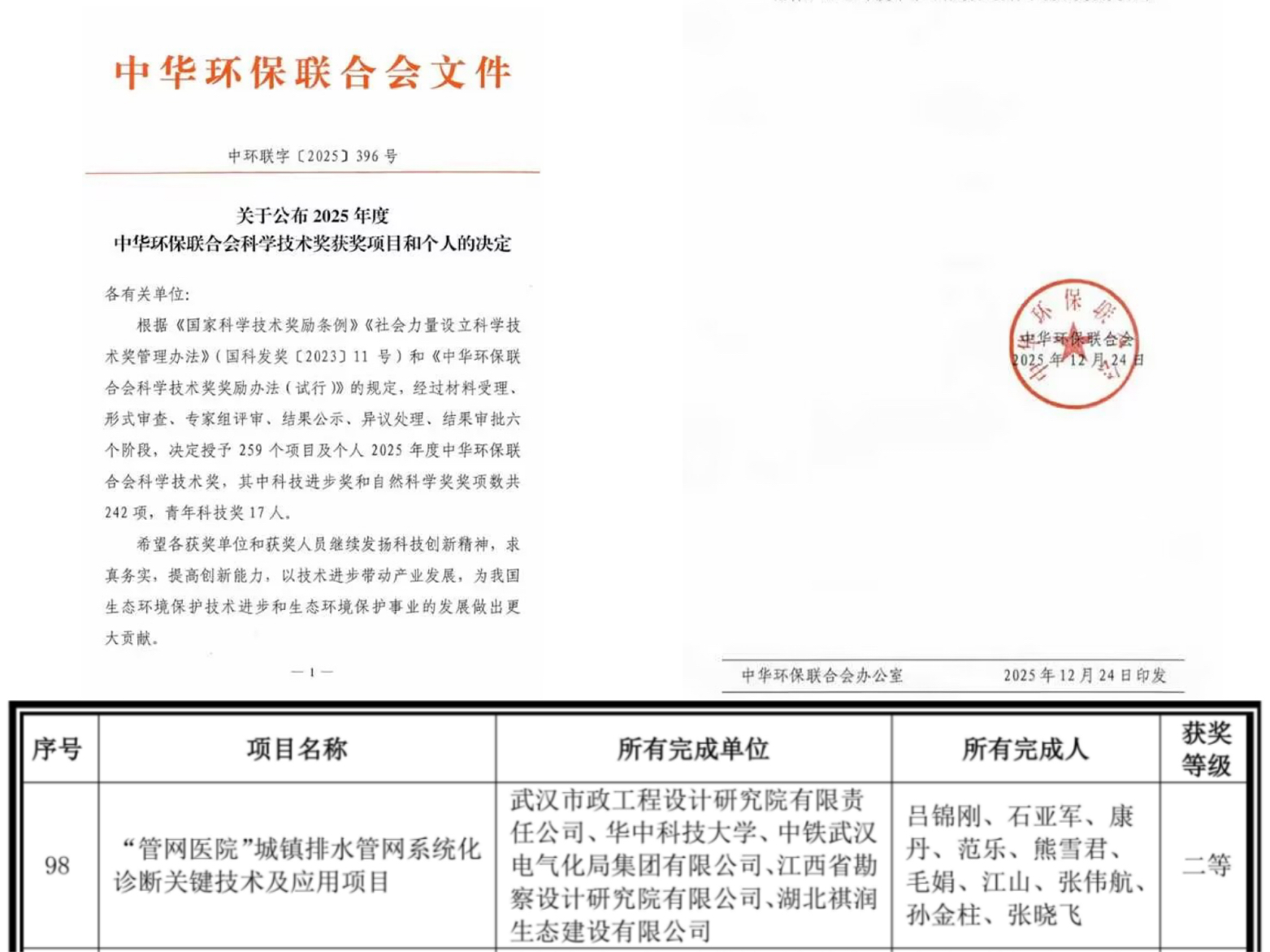 ? ? 近日,武漢市政院自主研發(fā)的“‘管網醫(yī)院’城鎮(zhèn)排水管網系統(tǒng)化診斷關鍵技術及應用研究”,經中華環(huán)保聯合會在北京組織技術成果評價會議評審,順利通過科技成果評價,被認定為達到“國際先進水平”,并榮獲“2025年中華環(huán)保聯合會科技進步獎二等獎”。
