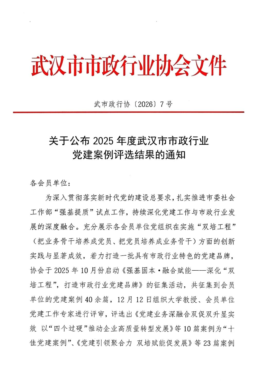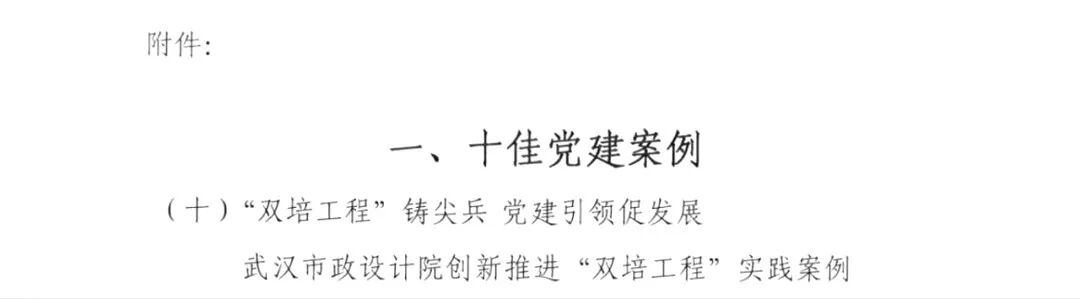 ? ? 近日,武漢市市政行業(yè)協(xié)會發(fā)布《2025年度武漢市市政行業(yè)黨建案例評選結(jié)果》,武漢市政院申報(bào)的創(chuàng)新實(shí)踐案例——《“雙培工程”鑄尖兵,黨建引領(lǐng)促發(fā)展》入選“十佳黨建案例”。
